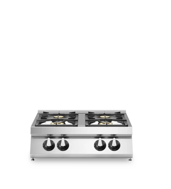 Stainless steel Italian stove on an open stand with 4 burners.